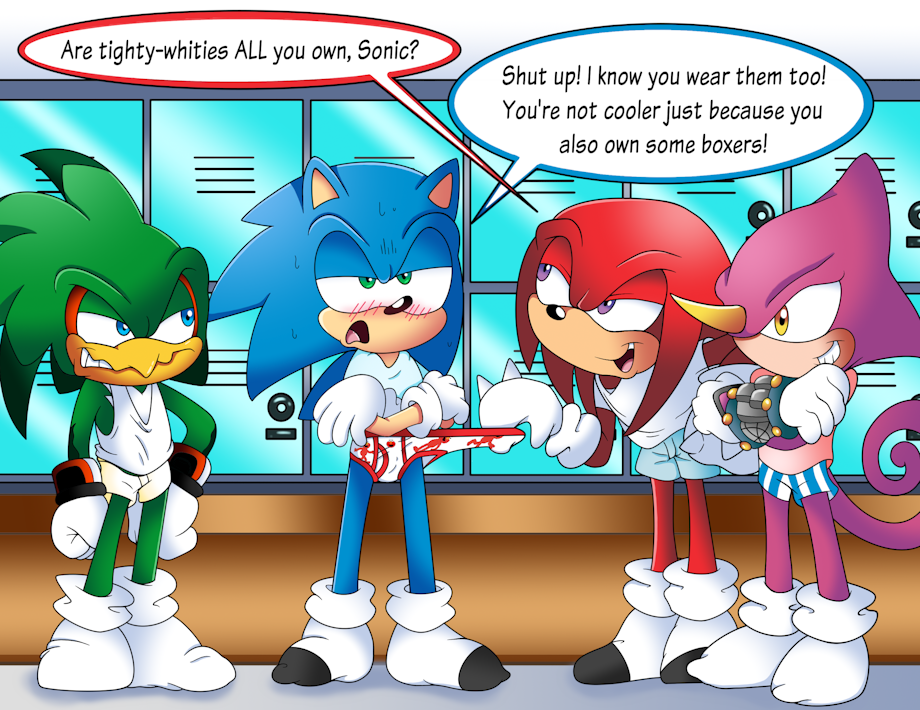 It's one of those traditional locker-room tales where you're seen as the loser if you're the only one in tighty whities among a group of boys in boxers. Although, it's significantly worse for Sonic here since he's clearly wearing underoos. Like, even wearing regular briefs would be better here.