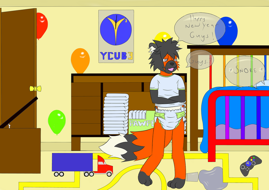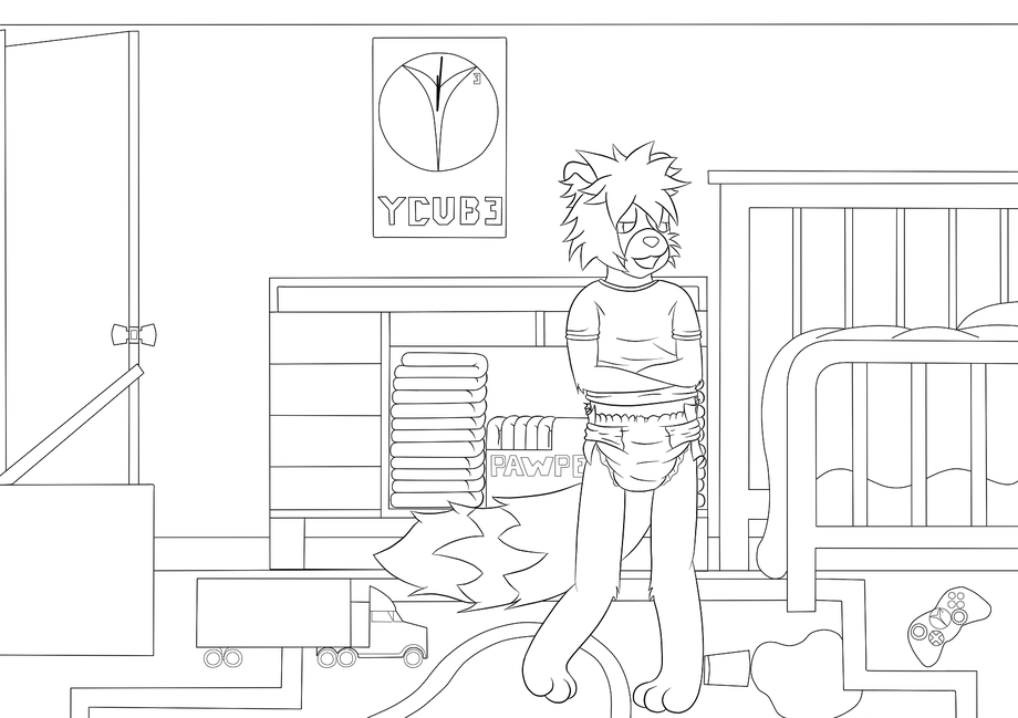 My finished half of an art-trade with lalobo-zorro. I'd would have like to shade it be I don't even know where to start with this one, It's already taken me too long to do anyways being such a huge picture. The original file resolution is absolutely absurd, at 8208 x 5794 pixels and 2.79 MB. I had the shrink it down to 20% of it's normal size to even upload it. I'm a bit new to sai so I haven't learned to shade in it yet, but I did try my and at some effects on the speech bubbles and the liquid that spilled from that glass on the floor there as will as the tinted-glass backing on the "YCUB3" clock in the background. And yea I know the changing table thingy back there has no Knobs...cubs can hurt themselves on knobs XD.