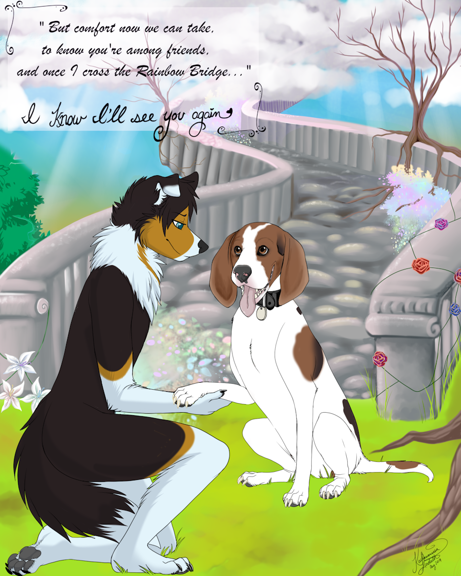 Though you may be gone you're forever in our hearts from the day we met you we loved you from the start You were taken from us suddenly and now we rend with pain the days will pass slowly never to be the same But comfort now we can take to know you're among friends and once I cross the Rainbow Bridge I know I'll see you again. -Rorick