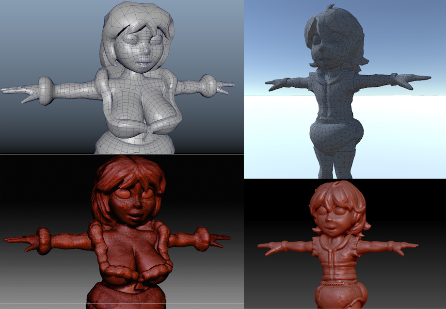 I managed to complete the character retopos, the process of taking a high polygon sculpt and re-constructing it to be low-poly, so that it can actually function in a video game without breaking it. But its not that simple, you also have to factor in how the joints will bend, and how much fidelity you want to give your model, when it animates. Its a very careful process. The low-poly model is about 5000 polygon faces, which is small enough for mobile devices, while the original zBrush sculpt was over 2 million, much work goes into optimizing the character to get them ready for their game. I also was able to unwrap the UVs on the Christi model, so that you can now see the high quality geometry information, projecting it's lighting and shading details onto the lower model, to make it look like the hi-poly poly. Its a simple trick of the lighting. I will be happy to finally color these 2 soon, but for now, I must thank all my game tier patrons for making this possible. ^^
