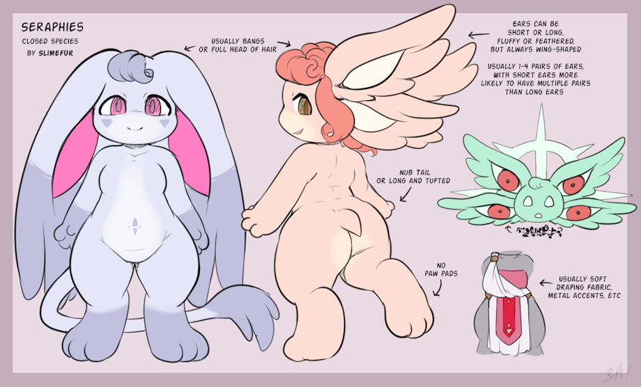 dunno if you are aware but, there already exists a speceis called "singing rabbats" from a webcomic called floraverse. rabbats have roughly similar characteristics and design though not as consistent. also saw janus promoting them on discord and was a bitchin hard time to actually find the original page since there's another adoptables thing out there called "seraphies" on top of a a random greek deity called Serapis that the search engine decided to autocorrect to