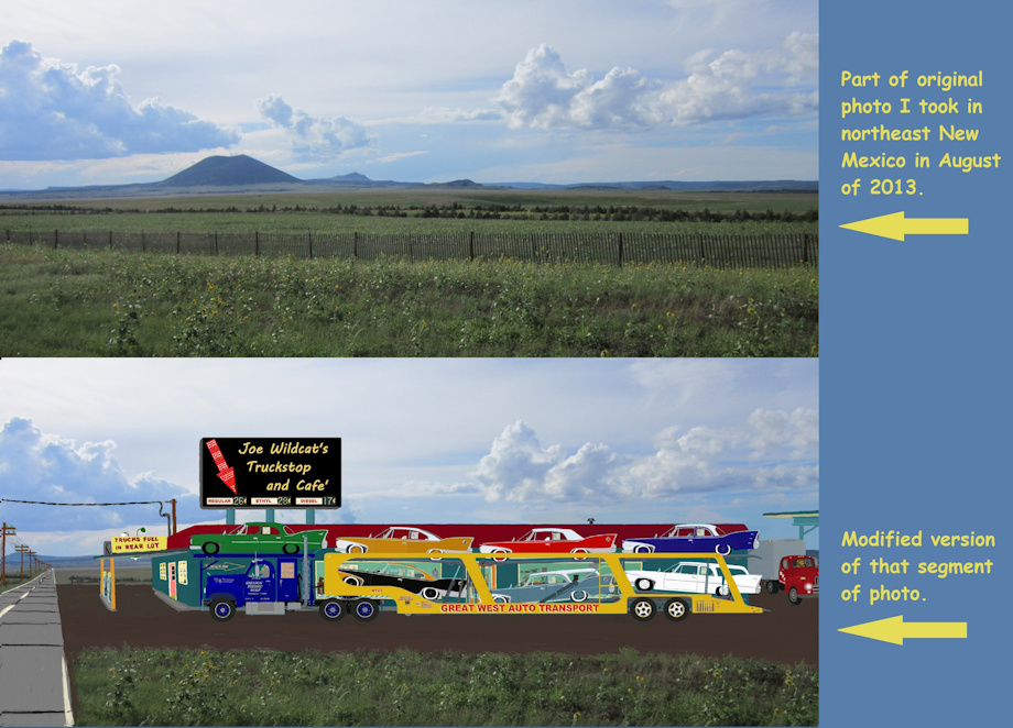 Pic # 1 This is Saturday, July 23rd of 1960. The place is south of the outskirts of Denver, Colorado. It is 7:00 in the evening, and Sheldon Wolf is leaving Joe Wildcat's Truckstop and Cafe' after fueling up his truck and getting some supper in the cafe'. This is facing south in the direction where Sheldon Wolf will travel to deliver brand new 1960 Plymouth automobiles to various dealerships; The white station wagon and the blue sedan is bound for Antonito, Colorado. The red convertible, gold & white coupe and the blueish gray station wagon is bound for Albuquerque. The black coupe and the green sedan are bound for LasCruces, New Mexico. Sheldon, like other independent truckers contracted by Great West Auto Transport, had picked up the load of cars at the Union Pacific Railroad depot in Denver...Those cars arrived along with other cars by rail from Detroit to Denver. By the way...The blueish gray station wagon is the one that Al and Marge Coyote had Dave Pine Martin order for them at Albuquerque Chrysler Plymouth. The highway, part of Route 285, is one of those narrow, concrete slab highways that is barely wide enough for two trucks to pass by each other. Despite the road being narrow, the speed limit on it is 70 mph because of it being so rural. Of course, not many motorists ever do abide by that 70 mph speed limit.