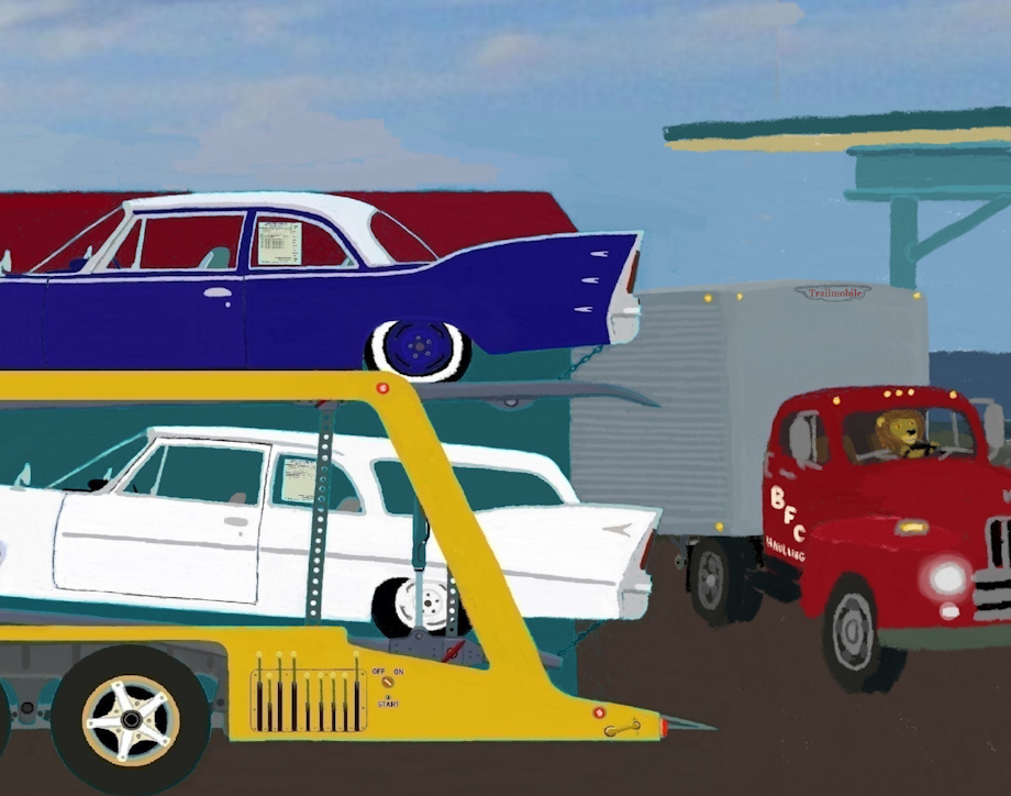 Pic # 1 This is Saturday, July 23rd of 1960. The place is south of the outskirts of Denver, Colorado. It is 7:00 in the evening, and Sheldon Wolf is leaving Joe Wildcat's Truckstop and Cafe' after fueling up his truck and getting some supper in the cafe'. This is facing south in the direction where Sheldon Wolf will travel to deliver brand new 1960 Plymouth automobiles to various dealerships; The white station wagon and the blue sedan is bound for Antonito, Colorado. The red convertible, gold & white coupe and the blueish gray station wagon is bound for Albuquerque. The black coupe and the green sedan are bound for LasCruces, New Mexico. Sheldon, like other independent truckers contracted by Great West Auto Transport, had picked up the load of cars at the Union Pacific Railroad depot in Denver...Those cars arrived along with other cars by rail from Detroit to Denver. By the way...The blueish gray station wagon is the one that Al and Marge Coyote had Dave Pine Martin order for them at Albuquerque Chrysler Plymouth. The highway, part of Route 285, is one of those narrow, concrete slab highways that is barely wide enough for two trucks to pass by each other. Despite the road being narrow, the speed limit on it is 70 mph because of it being so rural. Of course, not many motorists ever do abide by that 70 mph speed limit.