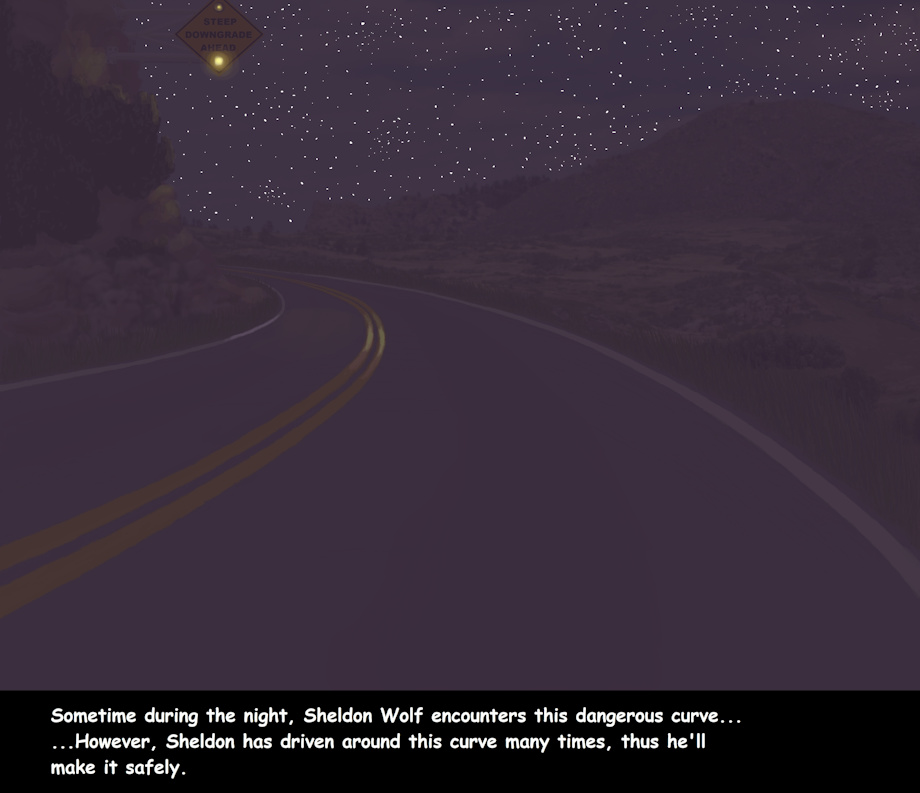 Pic # 8 Antonito is near the New Mexico border, thus that will keep Sheldon on the road until around midnight before he stops to get some sleep for the night. Sheldon encounters this curve sometime during that night drive, but he has driven this highway many times and knows how dangerous that curve is.