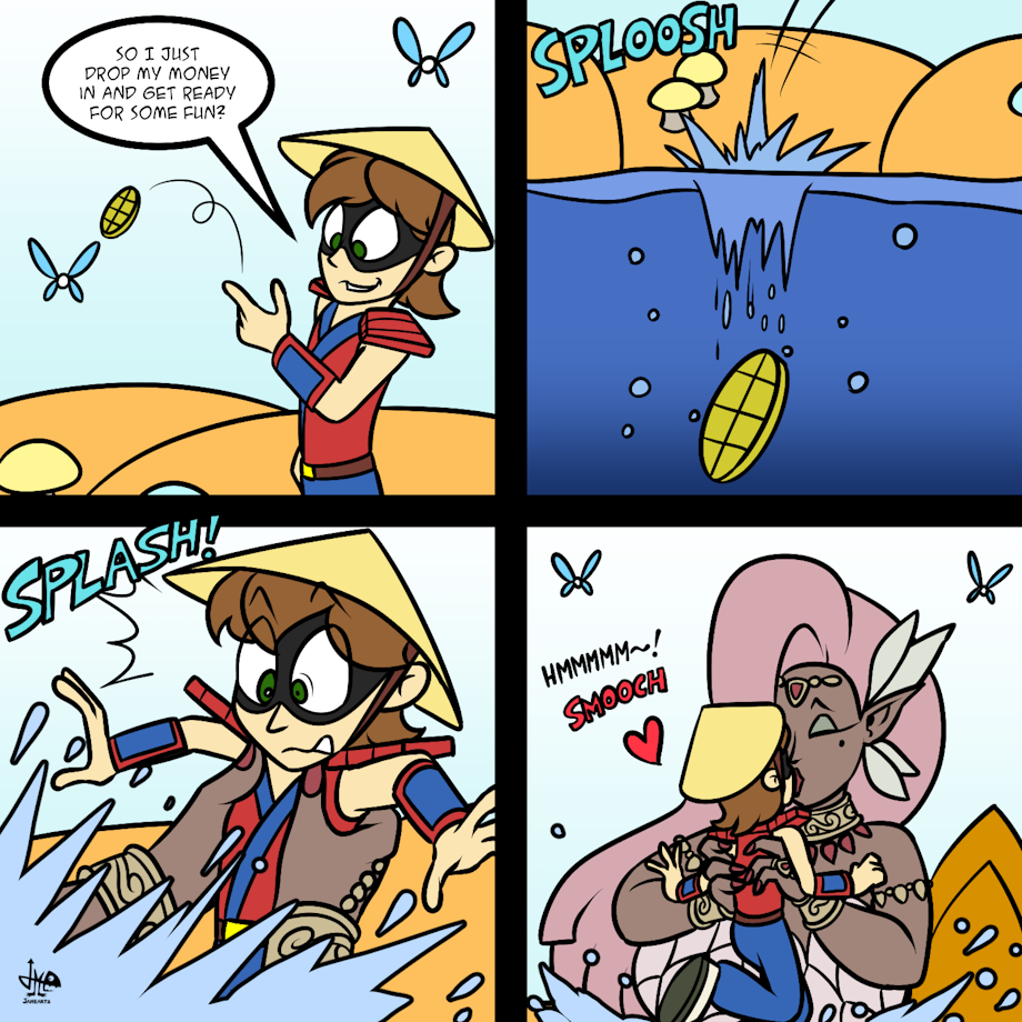 They usually work with rupees. We don't know how much does a koban coin cost in that currency, so Tsurugi will have to find out by how long will she be kissing that guy.