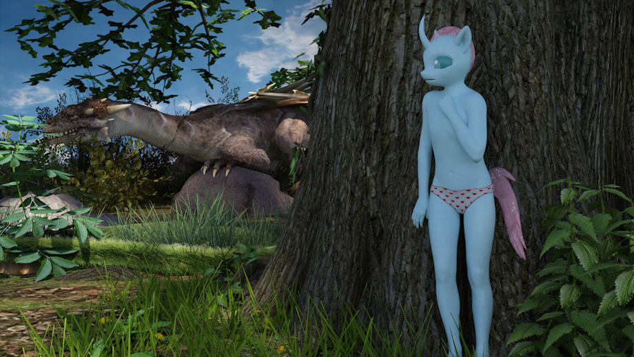 The little cute Changeling Ocellus just went to explore a forest, but she, unfortunately, came across a huge dragon. Which chased her deep in the forest, and the poor cutie lost her clothes thanks to the overgrown vegetation of the forest, leaving her in her undies. But she's now sheltering behind a tree. Hopefully, the dragon will leave.