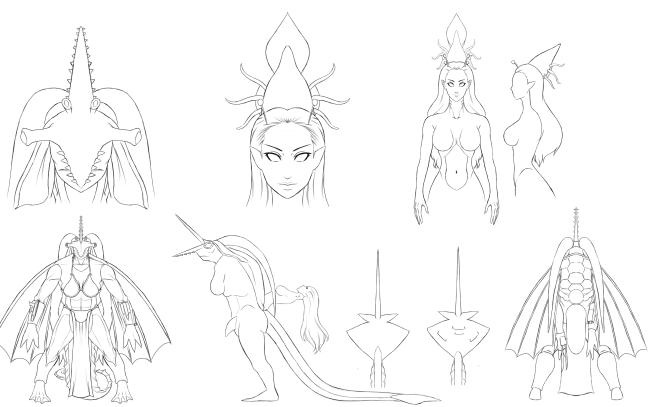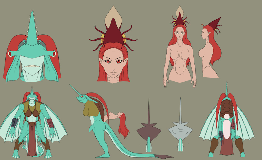 Description: A genetic combination of several different alien species like the work of Cylo. The head is where all the more obvious crossbreed species features are going to be seen with an Ithorian or Rakata (also known as the Builders)-like head shape, with a Vurk's sloping bony head crests but lined with sharp transverse teeth, arranged in a way that resembles a saw, the mouth is similar to a Karkarodon's, long catfish-like whiskers of Mon Calamari or more like a Twi'lek's Lekku, and finally Haillus the finn-like ears of a Gungan. Its got four large muscular arms like those of a Besalisks with fused fingers like Penguin in Batman Returns. Its got wing-like fins on its upper shoulders that resemble those of a Stenax, S'kytri, or Diathim. They possess a hard tortoise-like shell of the Krieks. They got a secondary humanoid torso sicking out of their lower back they use as a lure to attract prey they looks like Blubreen or a Melodie, but with features of other species such as Nautolan's extrasensory head tendrils, Rodian's pointed ears, twin saucer-like antennae atop [its] heads, and a ridge of spines cresting [its] skull, Anguilla long arms, powerful hands, and long, muscular eel tail, the tail is tipped with near a full replica body of a Brith. Its notable for its impressive height, strength, and agility, with its muscular digitigrade legs enabling them to run faster, jump higher and farther, and move more quietly than humans. Their large finger pads and prehensile webbed toes assisted them in swimming.