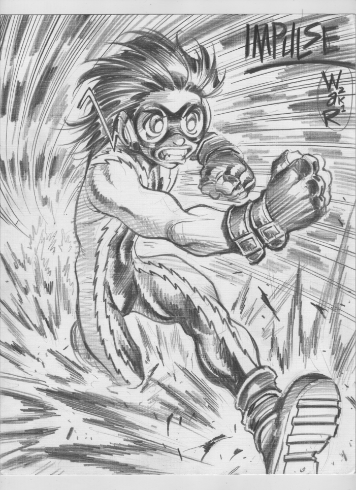 there was a teen super hero in the late 90s early 2000`s from DC called Impulse. Bart Allen was from the distant future and traveled back to our time to be mentored by a super speedster named Max Mercury .Anyway I liked the character a lot and got a few different artists to draw him including Adam Warren https://www.deviantart.com/adamwarren/gallery