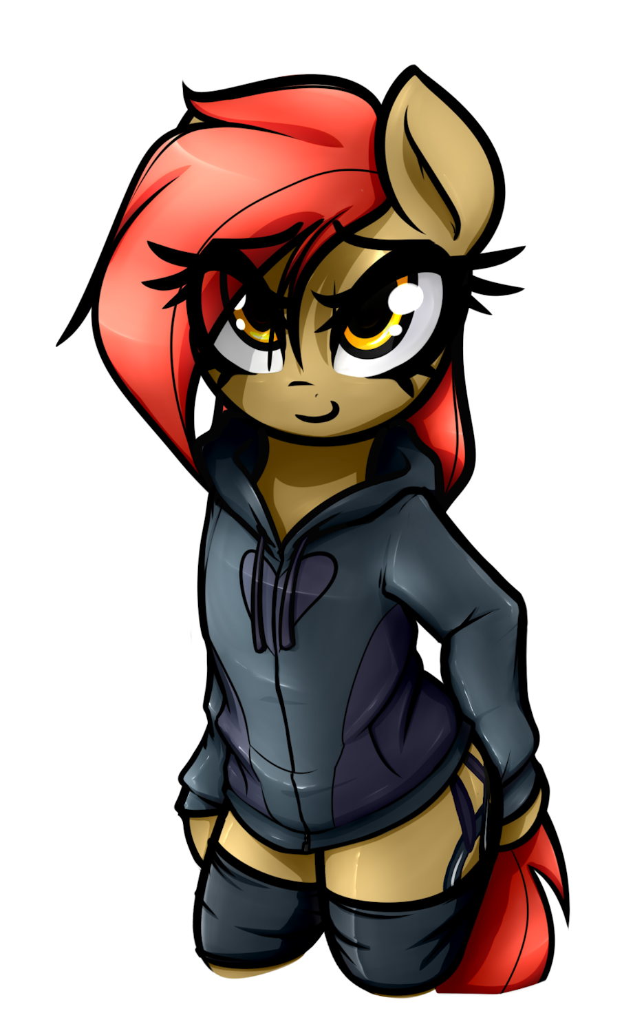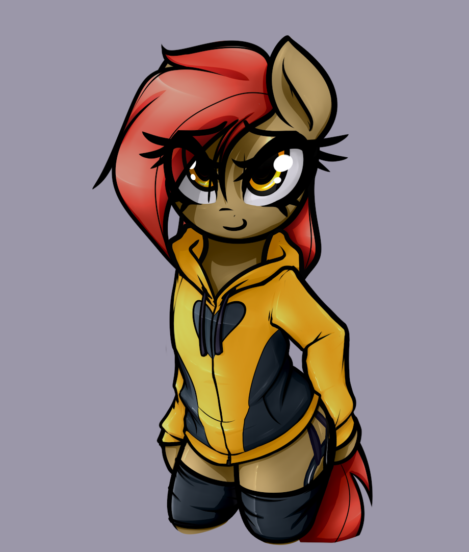 Combined my fondness for hoodies with my Dala in a semi-anthroish position. Was really fun to make and slapping the same material/shade onto the hoodie as her jacket worked surprisingly well. When I look at her I just wanna put my hands in her pockets for an embrace from behind if you know what I mean. As usual I'm completely sold by my own art heh. If there's more Dala fans out there, I hope this helps satisfy some of that thirst.