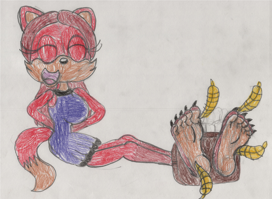 It's Fire the Fox wearing the gym attire I made her with her feet locked in stocks and feathers tickling her feet.