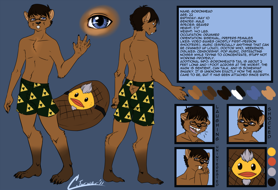 Rectangular, dark brown glasses. Goron mask, named Dave, on the tail.