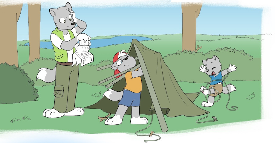 It's time for the annual Smith Family camping trip. This year Mike and Cheryl are bringing their almost-four-years-old niece Tabi. Like all family trips, they always start with cramming the vehicle with all the luggage. Mike is trying to shove every last bit in there, while Cheryl is politely pointing out better ways to do it and keeping her youngest entertained throughout the process. Kyle is dragging a large bag of supplies while Tabi is "helping" load.