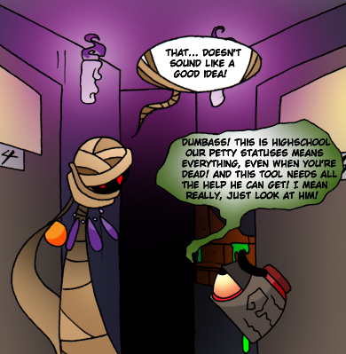 This isn't exactly the best drawn thing, but I do like how you make the speech bubbles unique to each character. Especially the mummy's--pretty unique, and kind of cute, how his bubbles are wrapped up in bandages.