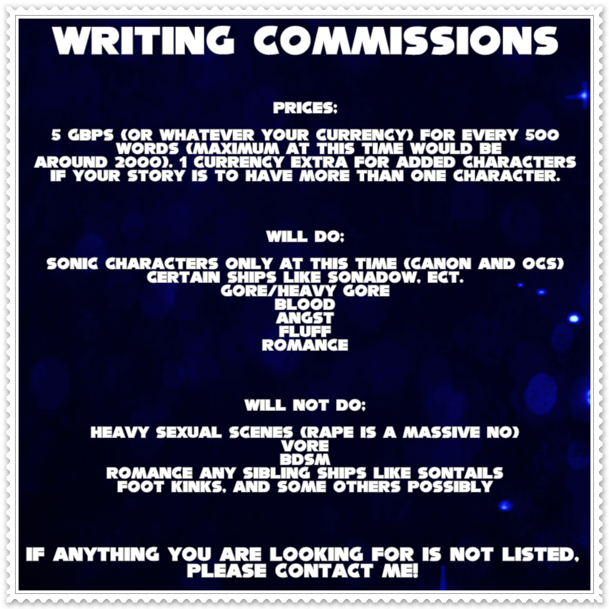Basically, PM me with a prompt, how many words you want me roughly end with and how many characters you'd like! Once I have said yes, I will accept the money into my PayPal and then go on to work on your commission!
