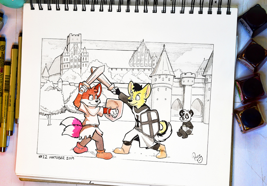 and Mahkah doing a historic demonstration of a battle. Mahkah as a Teutonic Order Knight.