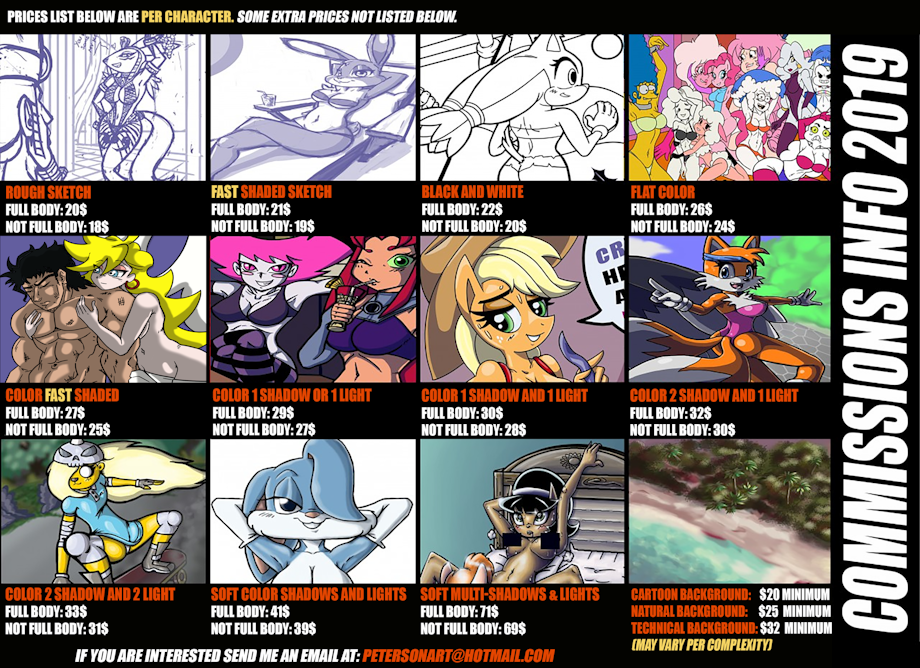 Due to paypal fee increment and modifications on my country, these prices are rised. Unless you have another payment method to avoid the fees so that the prices above could be lowered. Sorry for this. At least these prices have already the paypal fee. Artistic Politics Info since May 2019 (PRICES PER CHARACTER): 1) All payments must be done at Paypal, to my paypal email = petersonart[at]hotmail.com 2) No Refunds. 3) No Private commissions.. 4) I will only start drawing the picture after receiving the payment. 5) I will send you the Public version which size is 100dpi resolution (which can be Horizontal or Vertical, depending what you choose). But you can pay a little extra price for 2k (200 dpi), 3k (300 dpi) or 4k(400 dpi) if you want :) Only if you are my PATRON you will be able to receive the PATREON VERSION of the Commission which should be at 400dpi resolution (over 4000x4000 pixels). 6) Only at Rough Sketch State You can modify anything you want. Later states (styles) will no longer be modified. 7) You can get previews of your picture at any time. This implies only a screen shot of the work, not the full picture. 8) Only the selected Style Picture will be sent to you. For example, if you paid for a Flat Color Style Pic you will only get that style and not the previous styles like Rough Sketch and Black and White Clean Style, that implies the order of making or reaching at that final style. 9) These Prices may change with time. 10) There are Extra High Prices not listed for "Special Fetishes" not of my taste such as (Diapers, Inflation, Big Sized or Massive Organs "parts", etc.). As well there are some low extra-prices for Technical or Special Objects, Special Line Art Work (Colored Lines, Detailed Line work, Bold & Thin Lines), Complex Clothes/Outfits, etc. Not shown in this chart. You can Contact me by Note, Discord, Email or at Stream, Thanks! Email: Petersonart[at]hotmail.com Discord: https://discord.gg/xWm5MDY Stream: https://picarto.tv/PetersonArt