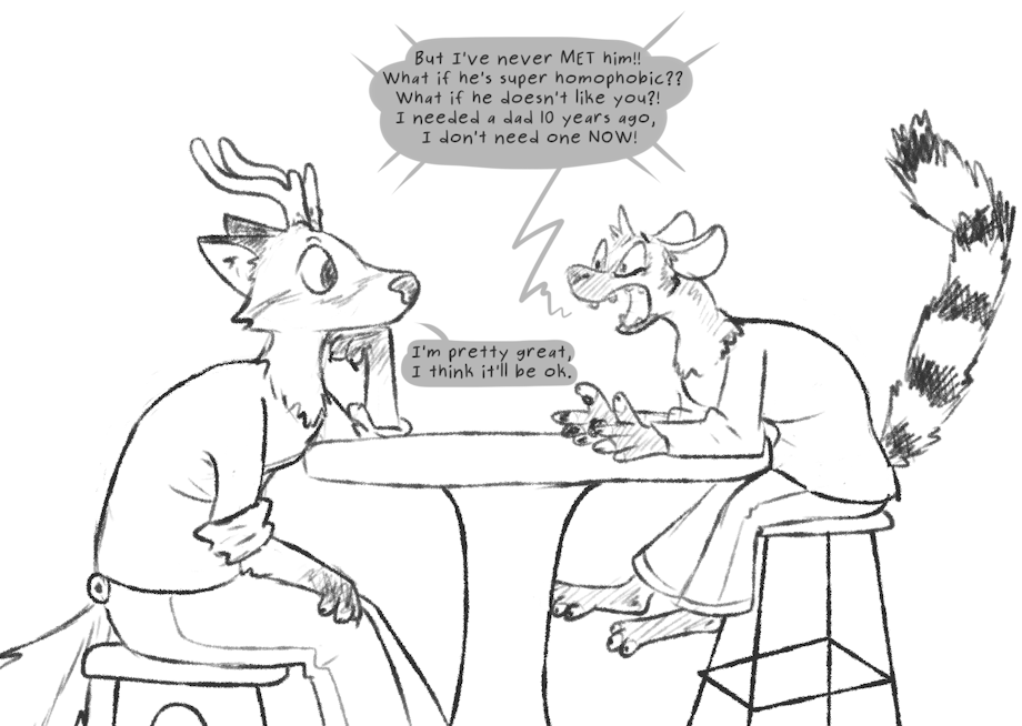 They have terrible posture from a life of trying to be small and not draw attention. Logan grows to deer size thought so he eventually just rolls with it. Forrester can pass for some weird lemur, cause they're all weird. Logan got really good at faking charisma and confidence. Forrester can actually pass as a non hybrid but is so paranoid that he keeps contemplating amputating his tail.