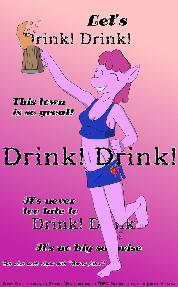 So "Berry Punch" is one of the crowd scene ponies who shows up a lot, and the fandom has basically decided she's an alcoholic. Apparently the people who do the show know of this interpretation, and have decided to not dispel it. Hearing this amused me greatly.