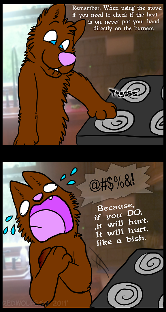 I'll admit, I do this often, accidently touching the stove top when it's on. (See our stove, you can't really tell if it's on, unless you wave your hand over it. Is confusing) Thought it was totally off, awhile back, pressed my hand directly into the center of the bloody burner. MAN that hurt. It had just been used, nobody bothered to tell me.