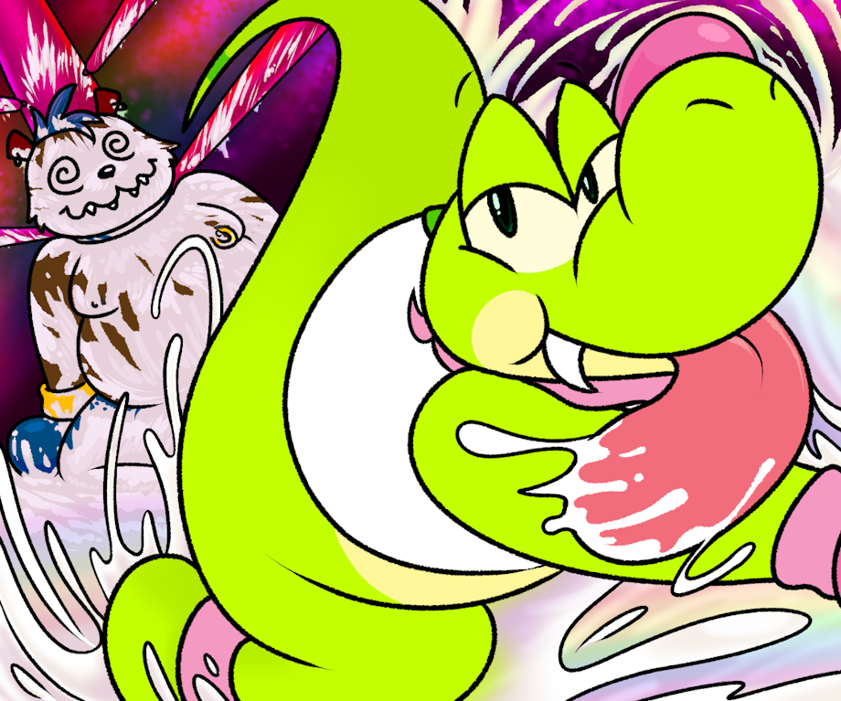 “Alright, alright. Let’s announce this next tag-team! They’re a couple of friends of mine, but I can’t give them special treatment because it would be really obvious. So give it up for your favorite team in the ring - Team Dino Pubes!” The crowd cheered until more confusion set in, mostly over the name. The fox lady playfully opened up the front of the reptile’s shorts and looked inside, “I don’t see any in there.” The lights all focused on her dino-pal, Nishi - outed for being completely bald downstairs. “Dinosaurs don’t grow hair down there! It’s normal. I’m an adult, so stop making fun of me!” the orange embarrassment whined. He scowled at his prankster partner, “Thanks a lot, Fuxie. You’re just showing off because you’re covered in fur.” He then looked to the cameras and pointed to her, “How about that!? Just look at her! She’s totally bushy! So bushy, it takes up her whole body! That’s so much weirder than me not being hairy.” The audience went silent at his attempt to embarrass Fuxie. Bushy beaver picked up her microphone to let Nishi know, “That’sh rude.” Biting his lip in nervousness, Nishi flipped his brown fox friend around, and pointed at her butt. “Haha! Well look at this, her butt’s covered in fur! She’s got a hairy butt, isn’t that weird!?” But after a long silence, the crowd started to react. “Hey, I have fur on my butt too, it’s not weird!” “Would you say that if a guy had a hairy butt? Hmmmm?” Nishi was in trouble - apparently it’s okay to make fun of people for not having fur, but making fun of them for having fur? Nope. Luckily, Fuxie grinned towards the camera, “Hey, that dinosaur was looking at my ass. Can you believe it?” The crowd cracked up as Nishi was now, not only hairless, but a butt-looker too. “I wish we could restart the competition right now.” Nishi sighed, and took Fuxie’s hand as they walked up to the boxing ring. There wasn’t any winning this crowd, but at least Fuxie was funny enough for their team to not be disliked.