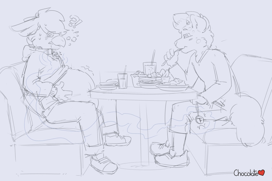 Though, the poor gryphon has no idea how he's getting so bloated when he just got a sandwich... And Rocket's the one stuffing his face with all that food!