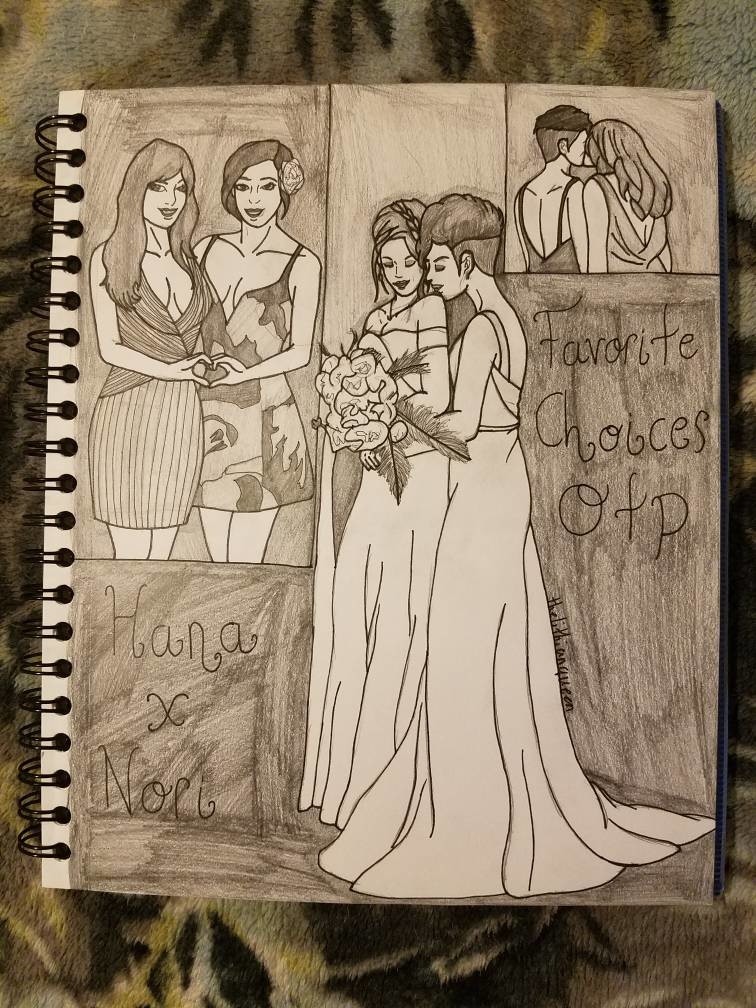 I saw prompt 13, Favorite Choices OTP, and drew Hana from The Royal Romance games with my character.