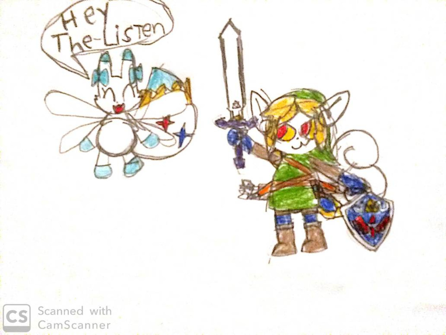 Starlight is dressed up as Link from Legend of Zelda in Super Smash Bros Ultimate as she rises up the Master Sword over her head and her partner Tama is being Navi the Fairy as she says "Hey The-Listen".