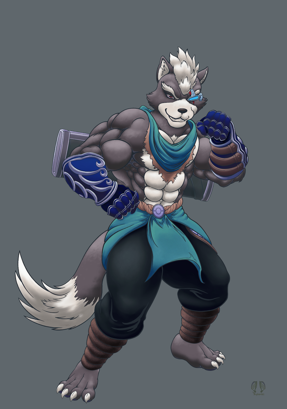 The finished commission of Wolf O'Donnell in the clothing of the wolf character in The Great Warrior Wall. The wolf character being the adult one from a flashback to the main character's childhood.