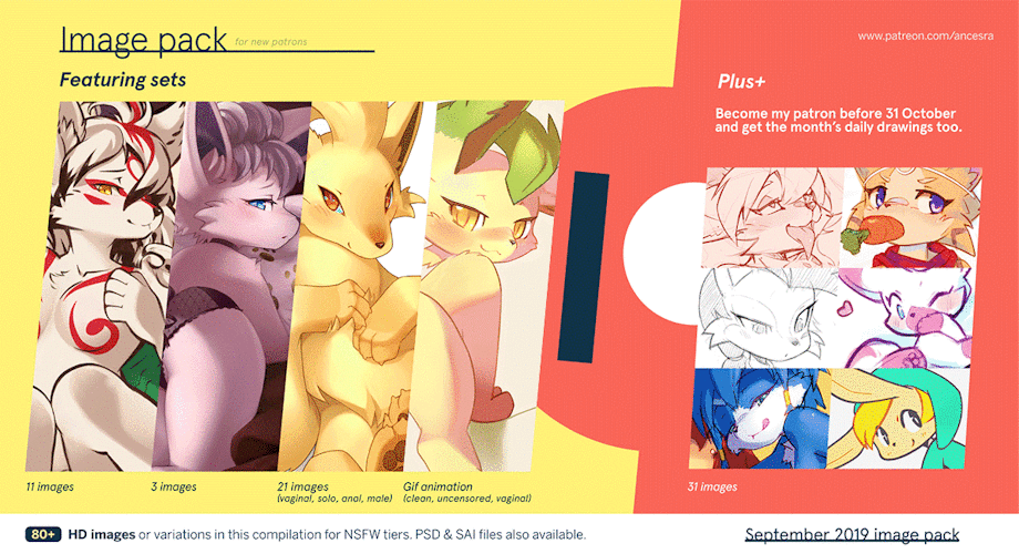 If your want the image pack just pledge to a 5$ or more tier on my Patreon during all this month (it doesn't need to be continuous subscription) and I will send it to you at the month's end.