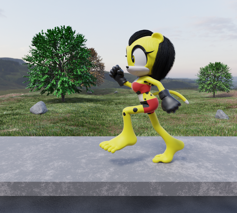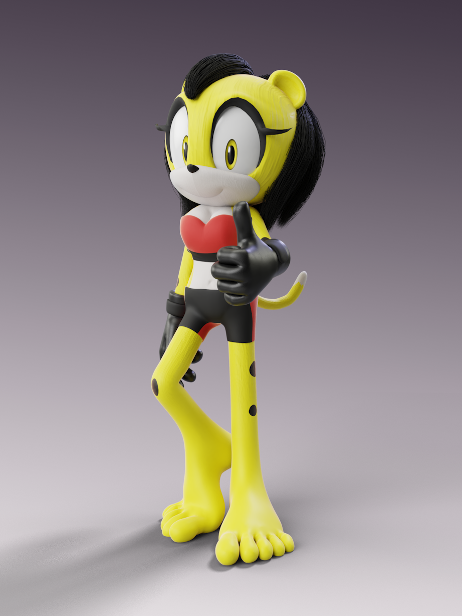 It's a 3D render of my most popular Mobian OC Kathy the Cheetah. He made it using Blender software and made her barefoot. In addition, he also added a bonus image of Kathy running barefoot.