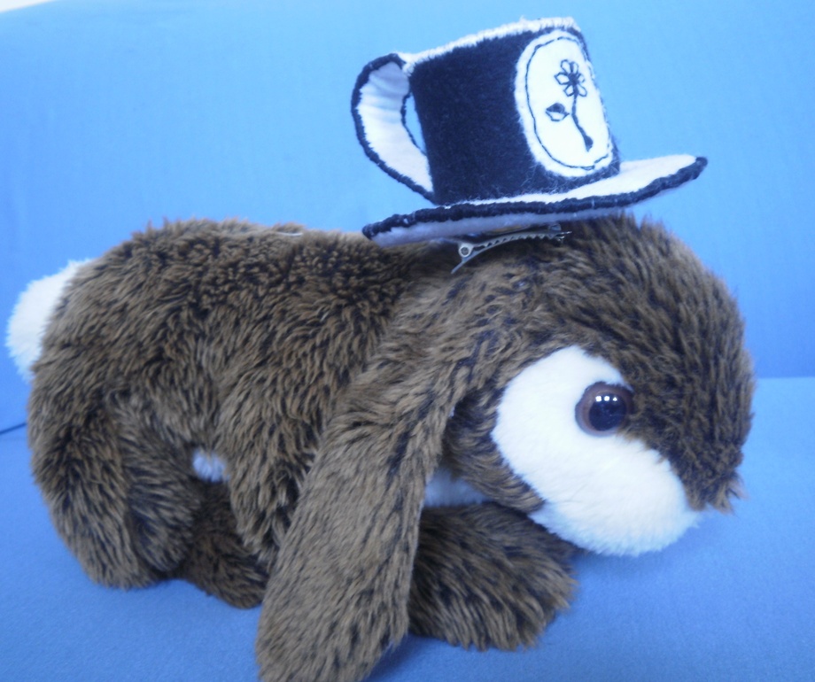 This is a teacup fascinatior hat. It is hand embroidered and filled with foam so it stays in shape while you are wearing it. My bunny looks good wearing it. He looks like he has come from wonderland for a visit.