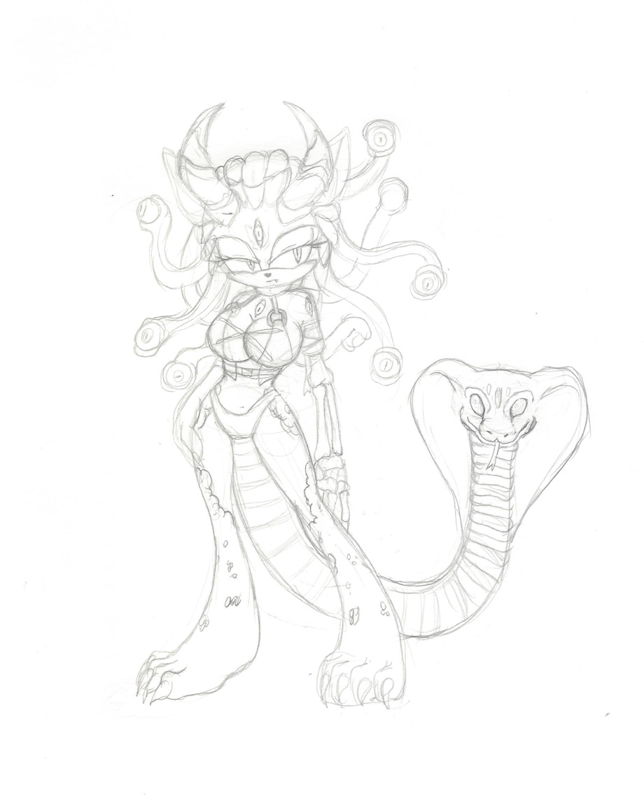a monster oc I created back in 20113. Medusa and the chimera monsters were inspirations for her creation. the only think I modified for her are her ears, horns, I made the snake a cobra and I removed her wings. I'll make the snake smaller if or when I color her.