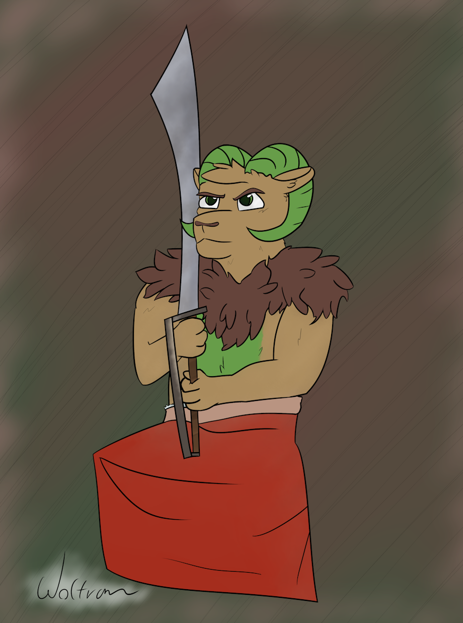 Wolfram the mouflon ram standing tall with his trusted two-handed falchion named Þúðr (thudder).
