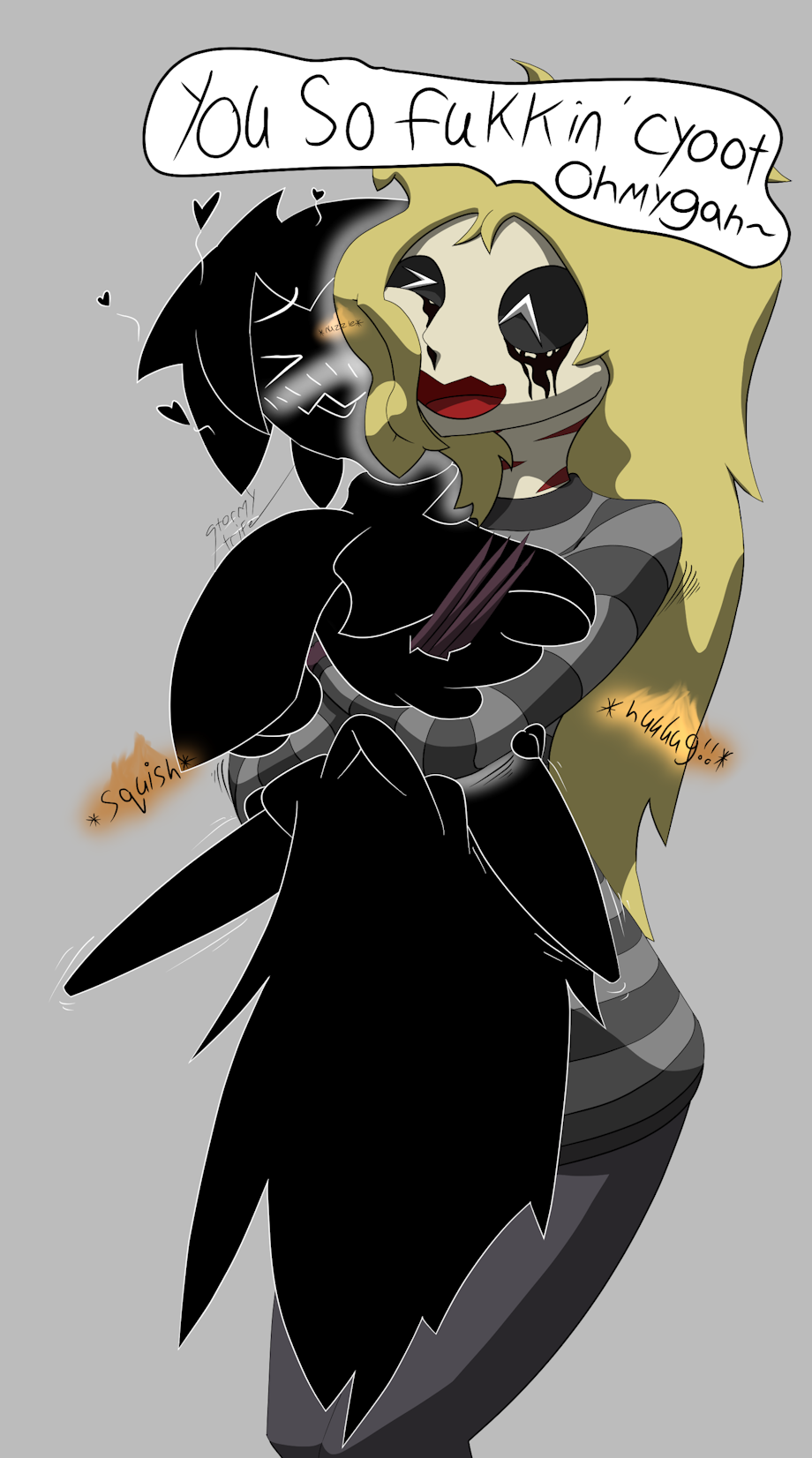 A Commission for a fellow artist known as Fouggie (found here: https://twitter.com/fouggie ) of their OC Sara hugging my sona, (who is still me, I love speaking in 3rd person) Shadie.