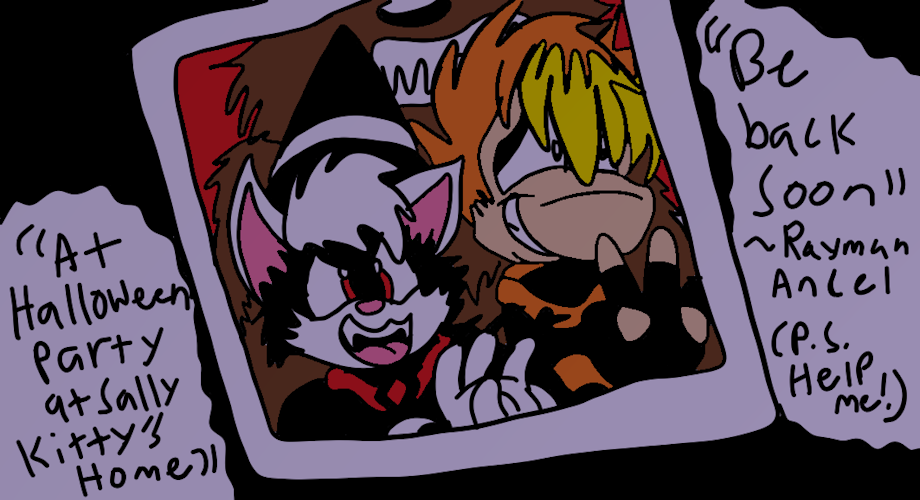 Happy Halloween from Hallowvania, with Rayman and Sally Kitty, The Wicked Witch! Featuring a huge werewolf behind them,which Rayman is really afraid of!