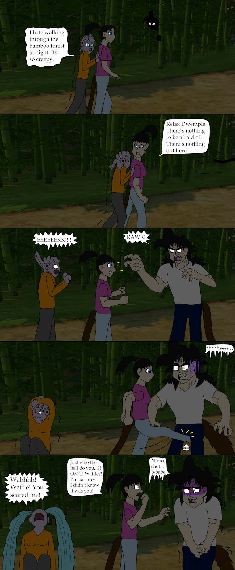 Well Waffle, I hate to say it but, that's what you get for being a smart ass XD. If you would have just let the girls alone you would have still had your ball intact. But hey, look on the bright side, if Scarlet does that enough then you won't have to worry about having children, right? XD Not sure which is the lesser of two evils though.