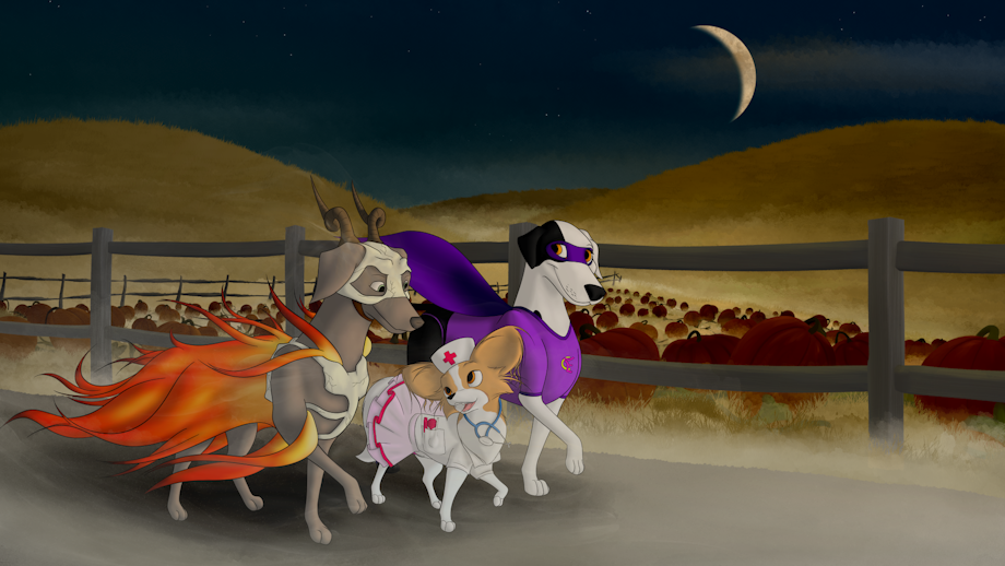 A collab between [iconnameNonfinite], [iconnameKinaj] and myself :3 Our three girls got together and are on their way to a super fun Halloween party. Nonfinite's Nalani went for a fiery demon look, Kinaj's Jess is dressed as his character Elasticollie, and my little Flossie is dressed up in a cute nurse outfit -w-