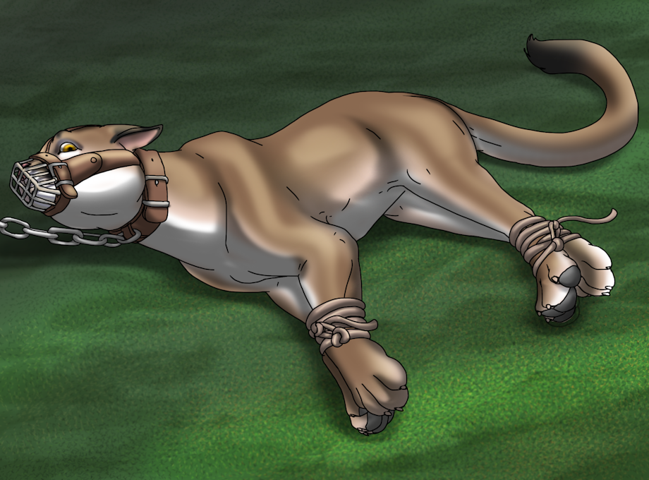 Hey, so the first of the month has rolled around, so it's time for Patreon rewards! I've been out of town the last week, so these aren't being released till now but here they are nonetheless. So first up we have a $20 Tier Patro, they wanted to see my Cougar character here Tovu bound and muzzled. It was an interesting request as they wanted the binds to be a little different than how they usually are. They wanted the fore and hind limbs tied up but not directly together, while being leashed and wearing a wire basket muzzle. It offered a good chance to playa round with rope work. I am pretty happy about the results and hope you are as well. More to come very soon.