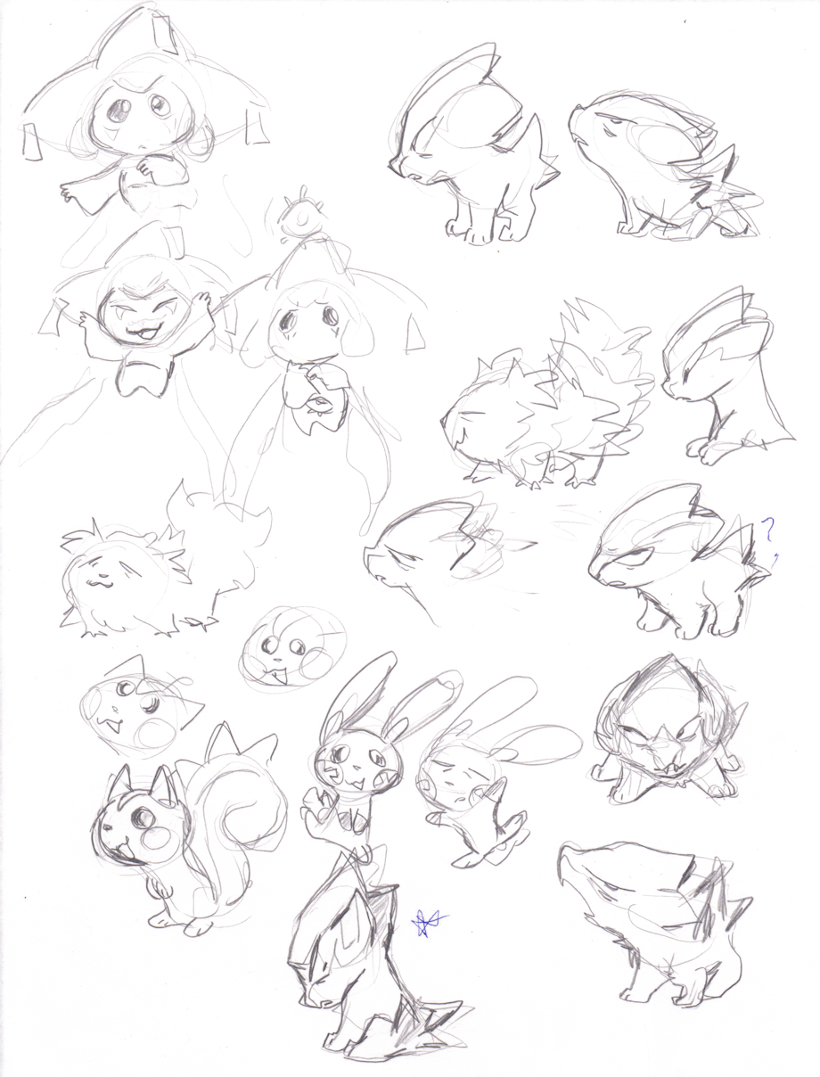 at the end, i dumped some sketches i had done traditionally to contemplate elektrike and zigzagoon.. it took a lot of thinking to reach my conclusions (dont mind the other doodles lol i was doing pokemon from memory)