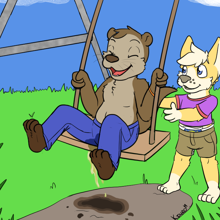 Request by @Corgz. I gave him artistic freedom, besides the fact that Lutari would be wet and happy. He decided to draw him being pushed bu his character Teddy on the swing, while happily wetting. I like the idea, and I think it turned out great.