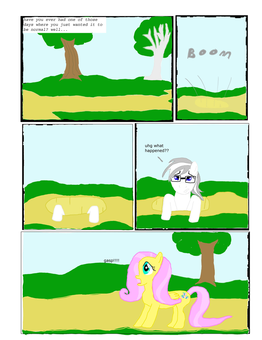 holy crap i acually finished this...ive had this idea floating around in my head for the longest time at work and i finished it i think i did a damn good job with my tablet i mean im no fantastic artist but i like it. the white pony is me i some how end up in ponyville turned into a pony and fluttershy spotted what happend. will i resume this dont know lol ill let you decide