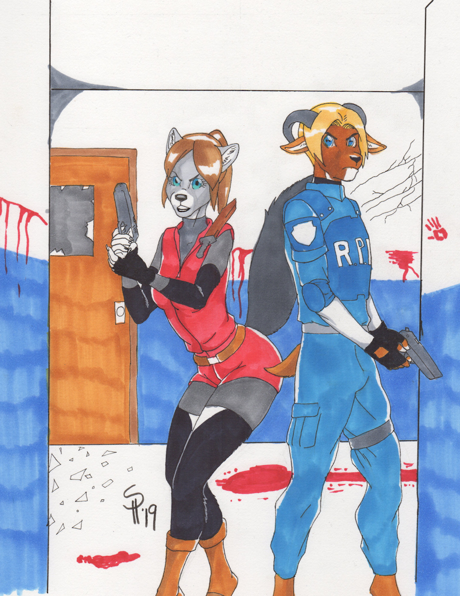 On to the art! Here is Sybil and Benjamin as Claire Redfield and Leon S. Kennedy ready to split up and go into their respective horror filled adventures. Full of conspiracies and atrocities. Ready to kick names and take ass in the zombie infested hallways of Raccoon City Police Department.