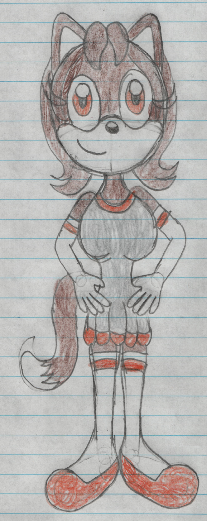 Felt like drawing Emily the Cat wearing a gymanstics outfit. It's silver with orange accenting and includes her long white gloves with orange stripes as well as her long white socks with orange stripes and orange slippers.