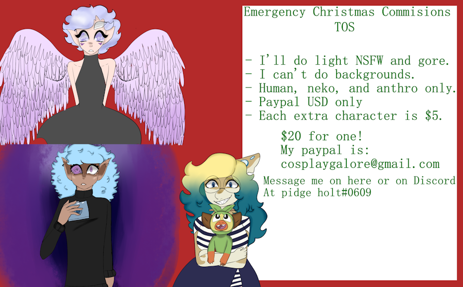 I’m doing emergency christmas commissions so I can buy my family and boyfriend presents. Because I feel bad about not getting them anything when they’ve been there for me all year!! And y’know, my boyfriend is my boyfriend. uwu