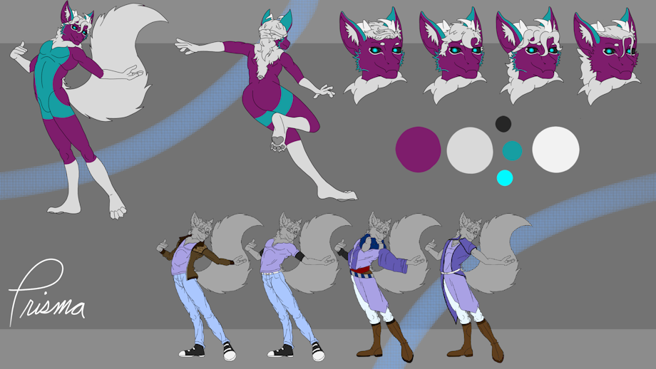 Prisma is a 5ft 10in purple, white, and green furred dragon with turquoise eyes that have black sclera. The white is his hair, arms and legs, and tail, along with a small line under the eyes. The green takes up the backs of the ears, tips of his cheek fur, and a spot along his chest that wraps around his thighs. The remaining space is purple.