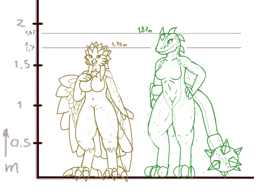 Roxanne is covered with scales in all her body, measures 1,87m she doesn't have claws and only have 3 toes, 4 fingers, doesn't have a navel but have a more worked abs, a ball of spikes in her tail, a crest with 5 scales from head to neck, she have a normal right arm but prefers to wear her glove, she excercises, have wide hips and thick thighs and is more rougher and angry, she is a "Bad girl", almost opposite to Miranda