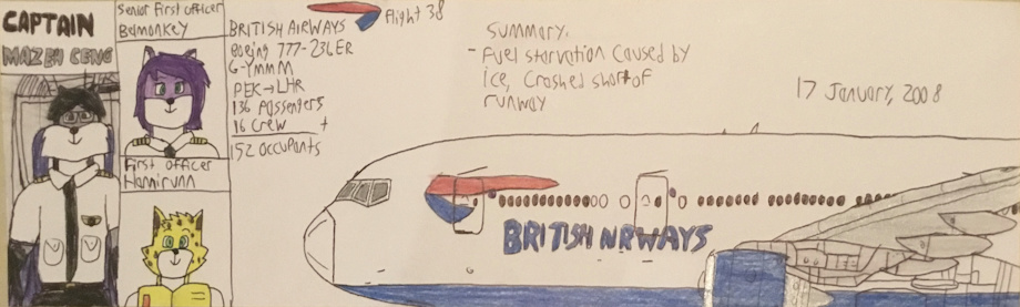 British Airways Flight 38 (IATA code "BA 38") is a scheduled passenger flight from Beijing Capital International Airport (PEK) in China to London Heathrow Airport (LHR) in the United Kingdom, a 8,100-kilometre (4,400 nmi; 5,000 mi) trip. The aircraft involved in the accident was a 150-tonne Boeing 777-236ER, registration G-YMMM (manufacturer's serial number 30314, line number 342), powered by two Rolls-Royce Trent 895-17 engines. The aircraft first flew on 18 May 2001 and was delivered to British Airways on 31 May 2001. It had a seating capacity for 233 passengers. On board were 16 crew members and 136 passengers. The crew consisted of Captain Mazeh Ceng, Senior First Officer Belmonkey, First Officer Hannirunn, and 13 cabin crew members. The captain had 12,700 total flight hours, with 8,450 in Boeing 777 aircraft. The senior first officer had 9,000 total flight hours, with 7,000 in Boeing 777 aircraft. The first officer had 5,000 total flight hours, with 1,120 in Boeing 777 aircraft.