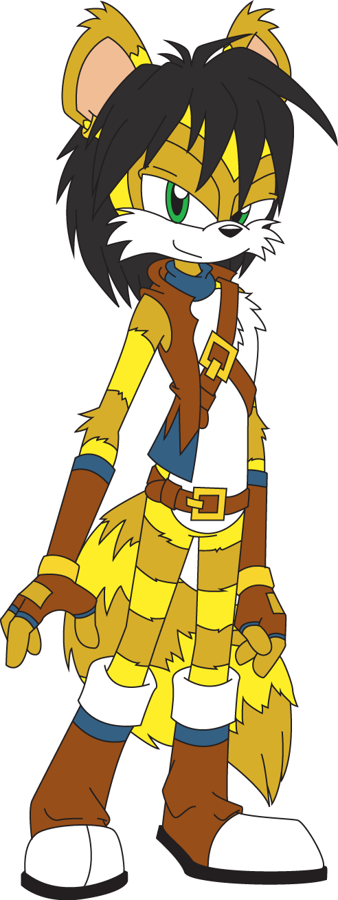 His fur is bright yellow with darker-colored stripes, facial mask and ear tips, with a white muzzle and chest. His hair is black, and he has green eyes.