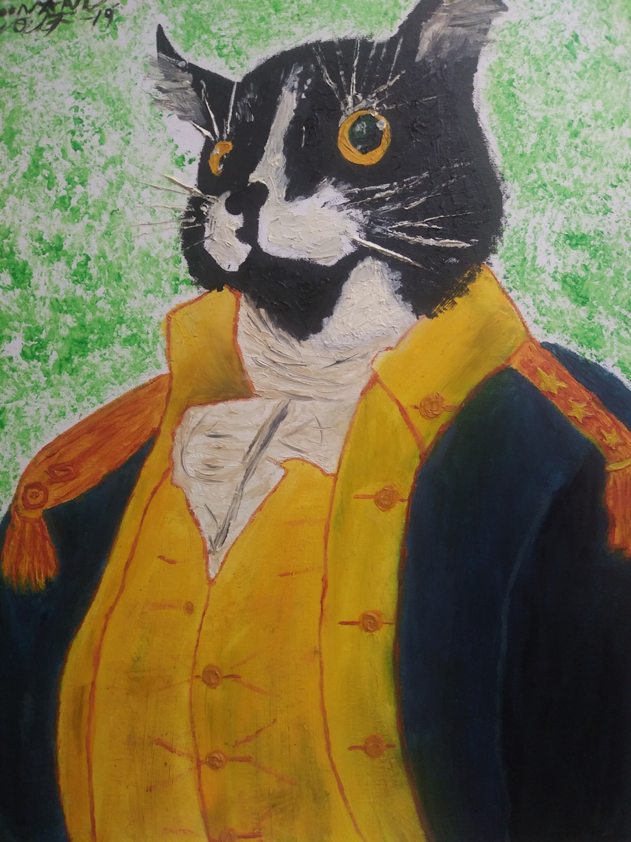 An xmas gift for my brother of his cat Meatball Bear in general George Washington's war uniform. Oil based paint