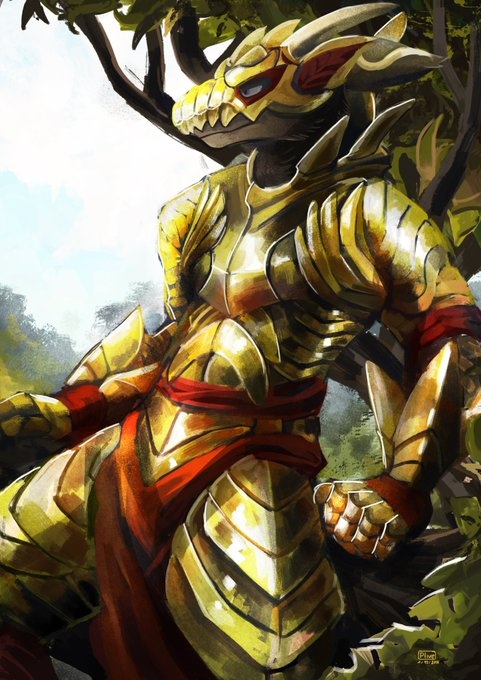 Ren is almost never serious given how powerful he actually is, but when he needs to be serious and become the ultimate sword and shield he adorns his sacred magic armor Irminsul, the living armor. Created from the very Earth itself and weaved together through Ren's magic. An armor that has a mind entirely of its own.